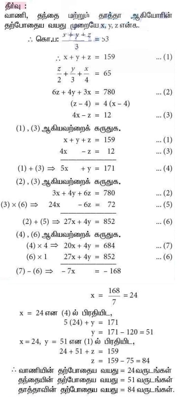 3. தாத்தா, தந்தை மற்றும் வாணி ஆகிய மூவரின் சராசரி வயது 53. தாத்தாவின் வயதில் பாதி, தந்தையின் வயதில் மூன்றில் ஒரு பங்கு மற்றும் வாணியின் வயதில் நான்கில் ஒரு பங்கு ஆகியவற்றின் கூடுதல் 65. நான்கு ஆண்டுகளுக்கு முன் தாத்தாவின் வயது வாணியின் வயதைபோல் நான்கு மடங்கு எனில் மூவரின் தற்போதைய வயதைக் காண்க?