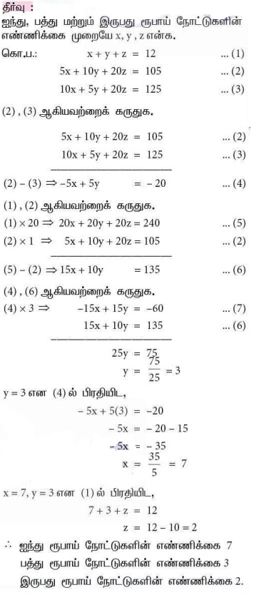 5. ஐந்து, பத்து மற்றும் இருபது ரூபாய் நோட்டுகளின் மொத்த மதிப்பு ₹105 மற்றும் மொத்த நோட்டுகளின் எண்ணிக்கை 12. முதல் இரண்டு வகை நோட்டுகளின் எண்ணிக்கையை இடமாற்றம் செய்தால் முந்தைய மதிப்பை விட ₹20 அதிகரிக்கிறது எனில், எத்தனை ஐந்து, பத்து மற்றும் இருபது ரூபாய் நோட்டுகள் உள்ளன?