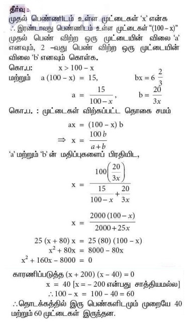 9. இரு பெண்கள் 100 முட்டைகளைச் சந்தைக்கு விற்பனைக்கு எடுத்துச் செல்கின்றனர். இருவரிடமும் சம எண்ணிக்கையில் முட்டைகள் இல்லை எனினும் முட்டைகள் விற்ற தொகை சமம் ஆகும். முதல் பெண், “உனது முட்டைகளை நான் விற்றிருந்தால் நான் ₹ 15 சம்பாதித்திருப்பேன்” என இரண்டாவது பெண்ணிடம் கூறினாள். அதற்கு “உனது முட்டைகளை நான் விற்று இருந்தால் ₹ 6 2/3 சம்பாதித்திருப்பேன்” என இரண்டாவது பெண் பதிலளித்தாள். தொடக்கத்தில் இருவரிடமும் இருந்த முட்டைகளின் எண்ணிக்கை எவ்வளவு?