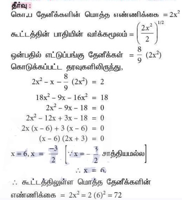 6. 2x2 எண்ணிக்கையுடைய கருப்பு தேனீக்களின் கூட்டத்திலிருந்து கூட்டத்தின் பாதியின் வர்க்கமூல எண்ணிக்கை கொண்ட தேனீக்கள் ஒரு மரத்துக்குச் செல்கின்றன. மீண்டும் கூட்டத்திலிருந்து ஒன்பதில் எட்டுப் பங்கு கொண்ட தேனீக்கள் அதே மரத்துக்குச் செல்கின்றன. மீதமுள்ள இரண்டு தேனீக்கள் மணம் கமழும் மலரில் சிக்கிக் கொண்டன எனில், மொத்தத் தேனீக்களின் எண்ணிக்கை எத்தனை?