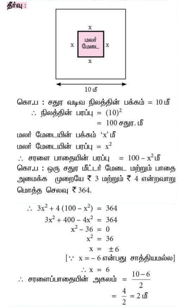 8. 10 மீ பக்க அளவுள்ள சதுர வடிவ நிலத்தின் நடுவில், ஒரு சதுர மலர் மேடையும் அதனைச் சுற்றிச் சீரான அகலமுள்ள சரளை பாதையும் அமைக்கப்படுகிறது. ஒரு சதுர மீட்டர் மேடை மற்றும் பாதை அமைக்க முறையே ₹3 மற்றும் ₹4 என்றவாறு மொத்தச் செலவு ₹364 எனில், சரளை பாதையின் அகலம் என்ன?