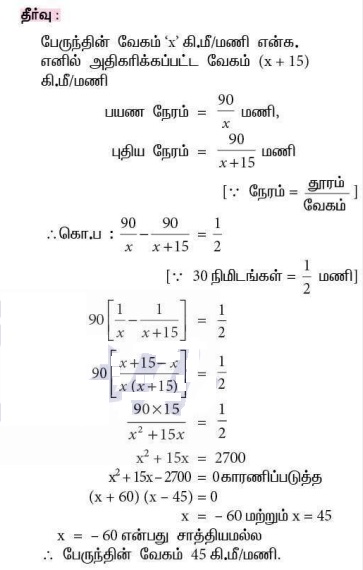 3. ஒரு பேருந்து 90கி.மீ தொலைவைச் சீரான வேகத்தில் கடக்கிறது. அதன் வேகம் 15 கி.மீ/ மணி அதிகரிக்கப்பட்டால், பயண நேரம் 30 நிமிடங்கள் குறைகிறது எனில், பேருந்தின் வேகத்தைக் கணக்கிடுக.