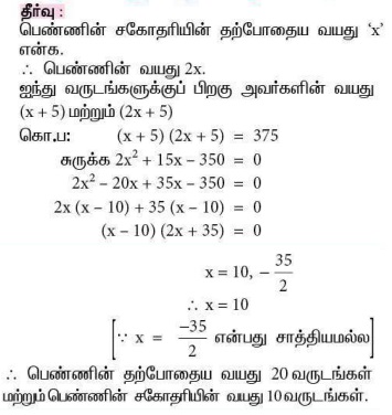 4. ஒரு பெண்ணின் வயது அவரது சகோதரியின் வயதைப் போல இருமடங்கு ஆகும். ஐந்து ஆண்டுகளுக்குப் பின் இரு வயதுக்களின் பெருக்கற்பலன் 375 எனில், சகோதரிகளின் தற்போதைய வயதைக் காண்க.