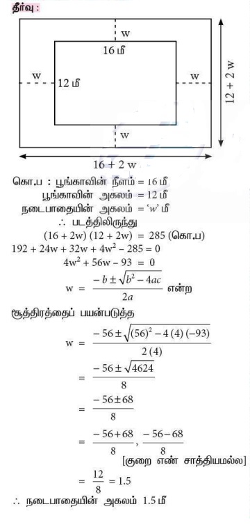 2. 12 மீ × 16மீ அளவுகள் கொண்ட ஒரு செவ்வக வடிவப் பூங்காவைச் சுற்றி 'w' மீட்டர் அகலமுள்ள நடைபாதை அமைக்கப்படும் போது, அதன் மொத்தப் பரப்பு 285 சதுர மீட்டராக அதிகரிக்கிறது. நடைபாதையின் அகலத்தைக் கணக்கிடுக.