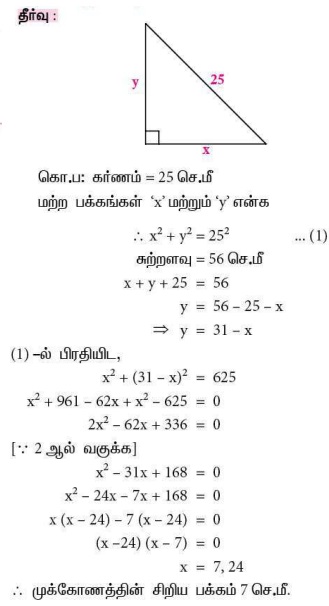 10. ஒரு செங்கோண முக்கோணத்தின் கர்ணம் 25 செ.மீ மற்றும் அதன் சுற்றளவு 56 செ.மீ எனில், முக்கோணத்தின் சிறிய பக்கத்தின் அளவைக் காண்க.
