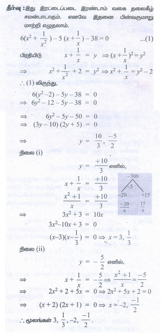 7. 6x4 − 5x3 − 38x2 − 5x + 6 = 0எனும் சமன்பாட்டின் ஒரு தீர்வு 1/3 எனில், சமன்பாட்டின் தீர்வு காண்க.