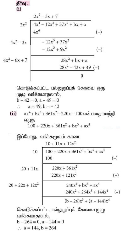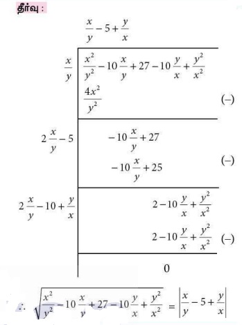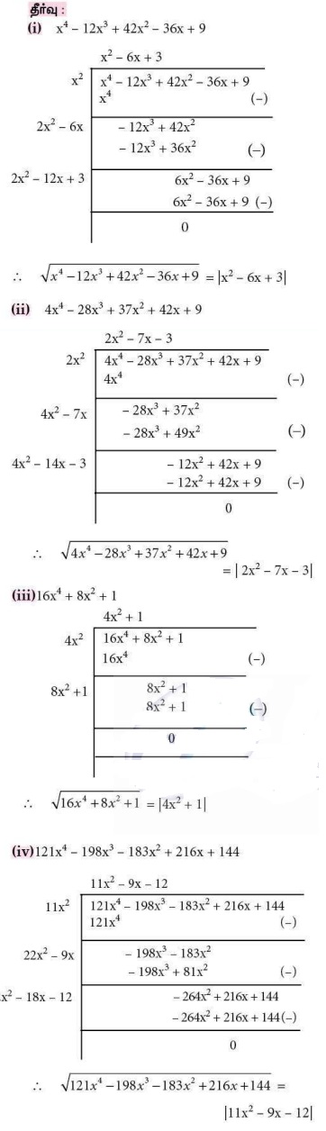 கேள்வி பதில்கள் மற்றும் தீர்வுகள் | கணக்கு - பயிற்சி 3.8 : வகுத்தல் முறையில் பல்லுறுப்புக் கோவையின் வர்க்கமூலம் காணல் | 10th Mathematics : UNIT 3 : Algebra