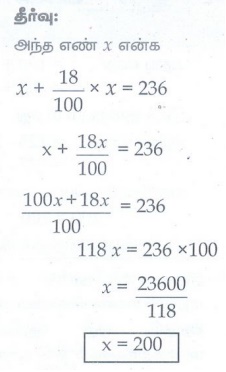 7. ஓர் எண்ணை 18% அதிகரித்தால் 236 கிடைக்கிறது எனில், அந்த எண்ணைக் காண்க.