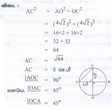 உள்ள வட்டத்தில் AB மற்றும் CD என்ற ஒன்றுக்கு ஒன்று செங்குத்தான விட்டங்கள் வரையப்பட்டுள்ளன எனில், நாண் AC இன் நீளம் காண்க. மேலும், ∠OAC மற்றும் ∠OCA காண்க.