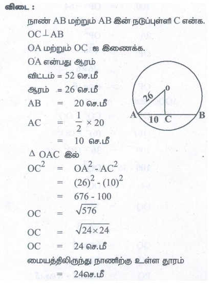 விட்டம் 52 செமீ மற்றும் ஒரு நாணின் நீளம் 20 செமீ எனில், மையத்திலிருந்து நாணிற்கு உள்ள தூரம் காண்க.