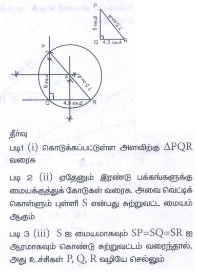 மற்றும் 6 செமீ அளவுகளைச் செங்குத்துப் பக்கங்களாகக் கொண்ட செங்கோண ∆PQR வரைந்து சுற்றுவட்ட மையம் காண்க மற்றும் சுற்றுவட்டம் வரைக.
