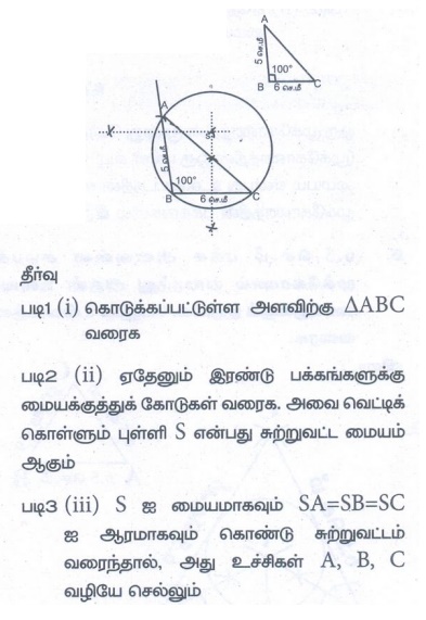 மற்றும் ∠B = 100° அளவுள்ள ∆ABC வரைந்து அதற்குச் சுற்றுவட்டம் வரைக மற்றும் சுற்றுவட்ட மையம் காண்க