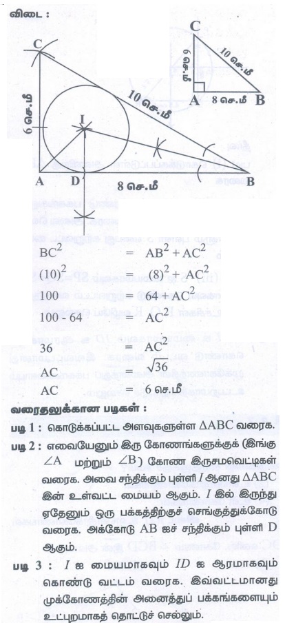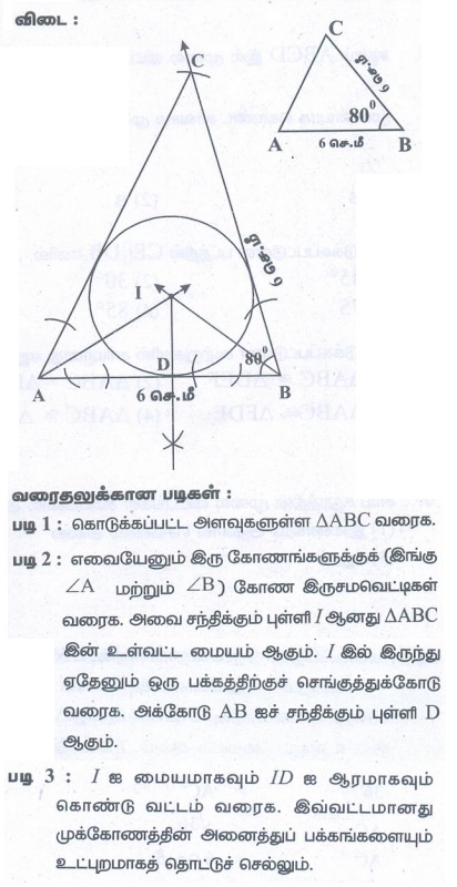 8. AB = BC = 6செமீ, ∠B = 80° என்ற அளவுகளுக்கு ∆ABC வரைக. அதன் உள்வட்ட மையத்தைக் குறித்து உள்வட்டம் வரைக.