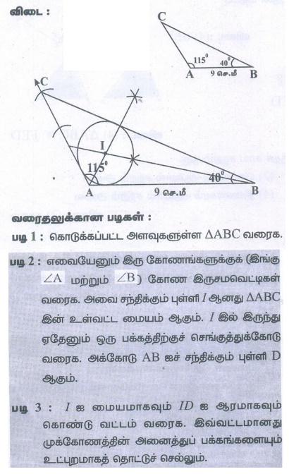 7. AB = 9 செமீ, ∠CAB = 115° மற்றும் ∆ABC = 40° என்ற அளவுகளுக்கு ∆ABC வரைக. மேலும் அதன் உள்வட்ட மையத்தைக் குறித்து உள்வட்டம் வரைக.