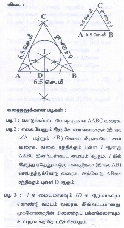 பக்க அளவுள்ள சமபக்க முக்கோணம் வரைந்து அதன் உள்வட்ட மையத்தைக் குறிக்க. மேலும் உள்வட்டத்தை வரைக.