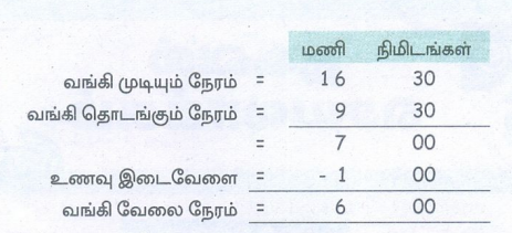 ஈ) ஒரு வங்கி காலை 9:30 மு.ப முதல் மாலை 4:30 பி.ப வரை இயங்குகிறது எனில், வங்கி இயங்கும் நேரம் எவ்வளவு?