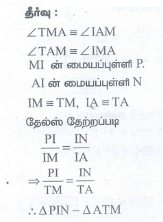 6. படத்தில், ∠TMA ≡ ∠IAM மற்றும் ∠TAM ≡ ∠IMA . P ஆனது MI இன் மையப்புள்ளி மற்றும் N ஆனது AI இன் மையப்புள்ளி எனில், ∆PIN ~ ∆ATM. என நிரூபி.