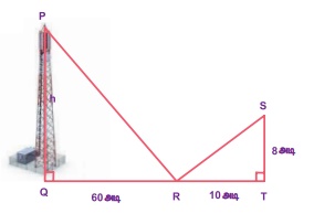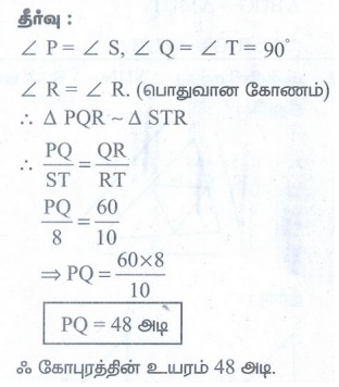 3. ஒரு கோபுரத்தின் உச்சியானது தரையில் R என்ற இடத்தில் உள்ள ஒரு கண்ணாடியின் மூலம் பிரதிபலித்து பார்க்கப்படுகிறது. ∆PQR ~ ∆STR எனில், கோபுரத்தின் உயரத்தைக் காண்க.