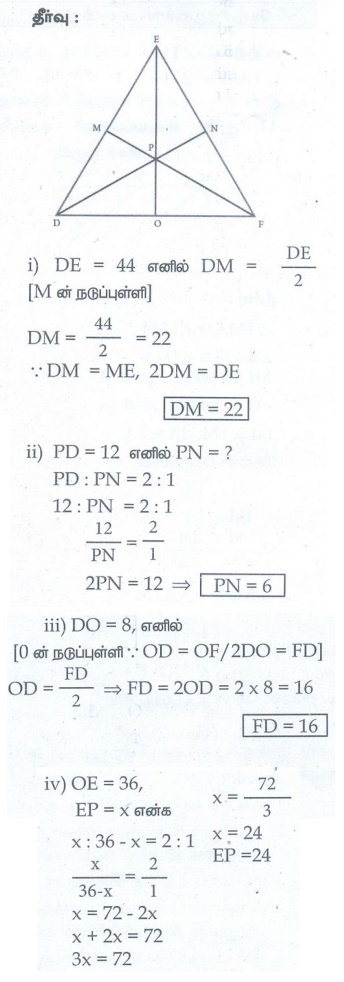 10. ∆DEF இல், DN, EO, FM ஆகியவை நடுக்கோடுகள் மற்றும் புள்ளி P ஆனது நடுக்கோட்டுமையம் ஆகும். எனில் பின்வருவனற்றைக் காண்க.