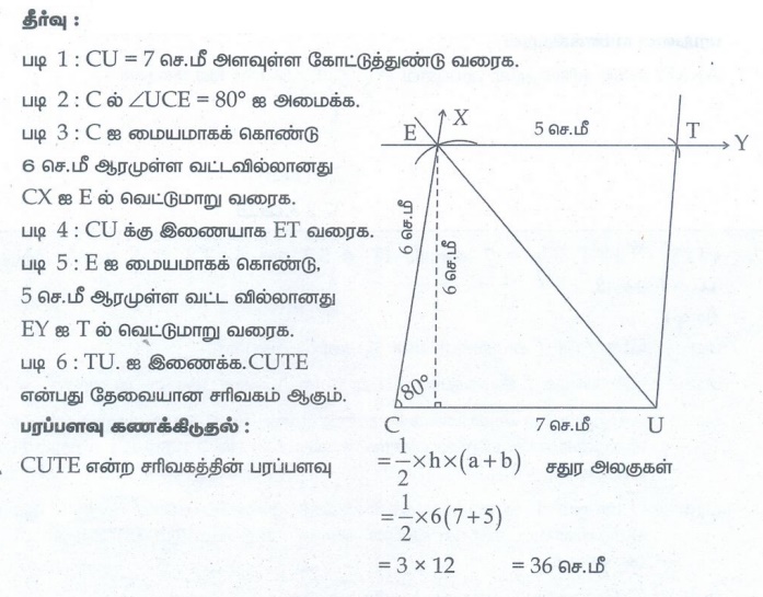 , CU =7 செ.மீ, ∠UCE = 80° , CE = 6 செ.மீ மற்றும் TE = 5 செ.மீ.