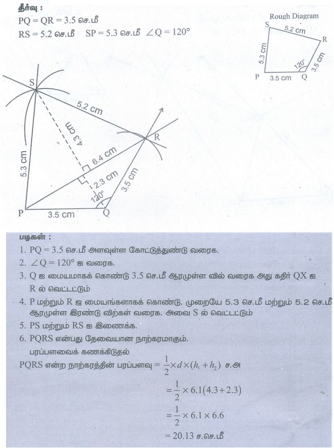3. நாற்கரம் PQRS, PQ=QR= 3.5 செ.மீ, RS = 5.2 செ.மீ, SP = 5.3 செ.மீ மற்றும் ∠Q =120°.
