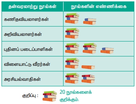 7. ஆறாம் வகுப்பிலுள்ள யாஸ்மினுக்கு அவரது பள்ளி நூலகத்திலுள்ள தன்வரலாற்று நூல்களை எண்ணும் பணிக் கொடுக்கப்பட்டது. அவரால் சேகரிக்கப்பட்ட நூல்களின் எண்ணிக்கை தரவுகள் பின் வருமாறு குறிப்பிடப்பட்டன.