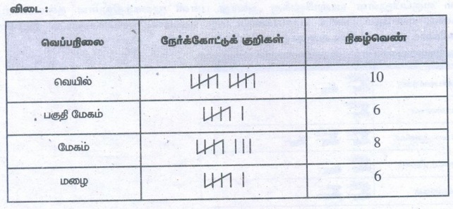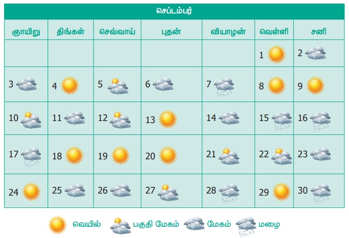 (i) நாட்காட்டியைக் கவனித்து வானிலை வகைகளின் நிகழ்வெண் அட்டவணை அமைக்க.
