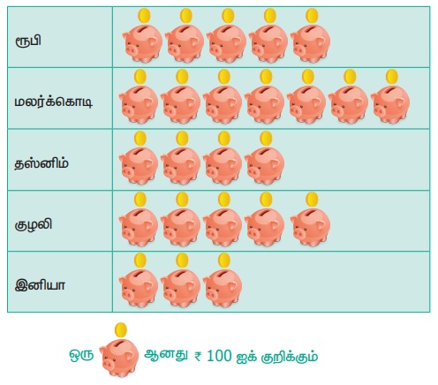 2. ஓர் ஆண்டில் 5 நண்பர்கள் சேமித்த மொத்த தொகை பின்வரும் பட விளக்கப்படத்தில் காண்பிக்கப்பட்டுள்ளது. ஒரு படத்தின் மதிப்பு 100. பின்வரும் வினாக்களுக்கு விடையளிக்கவும்.