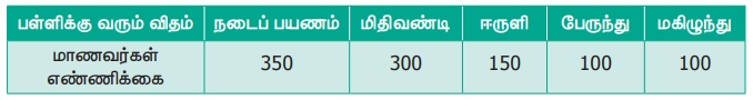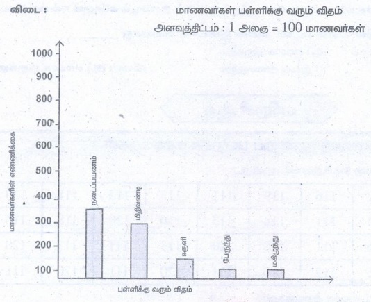 3. ஒரு பள்ளியில் 1000 மாணவர்கள் உள்ளனர். இம்மாணவர்கள் பள்ளிக்கு வரும் விதம் பற்றிய தரவுகள் பின்வரும் அட்டவணையில் தரப்பட்டுள்ளன. இத்தரவுக்குப் பட விளக்கப்படம் வரைக.