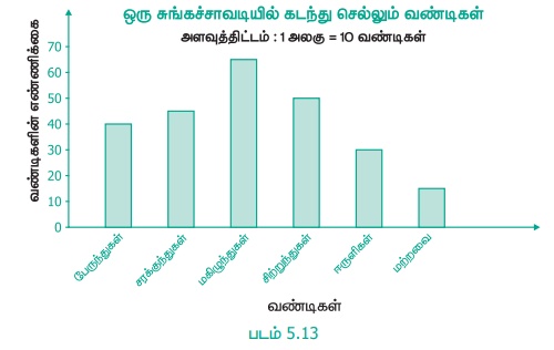 8. ஒரு சுங்கச்சாவடியில் 1 மணி நேரத்தில் கடந்து செல்லும் வண்டிகளின் தரவுகள் பட்டை வரைபடத்தில் காட்டப்பட்டுள்ளன.