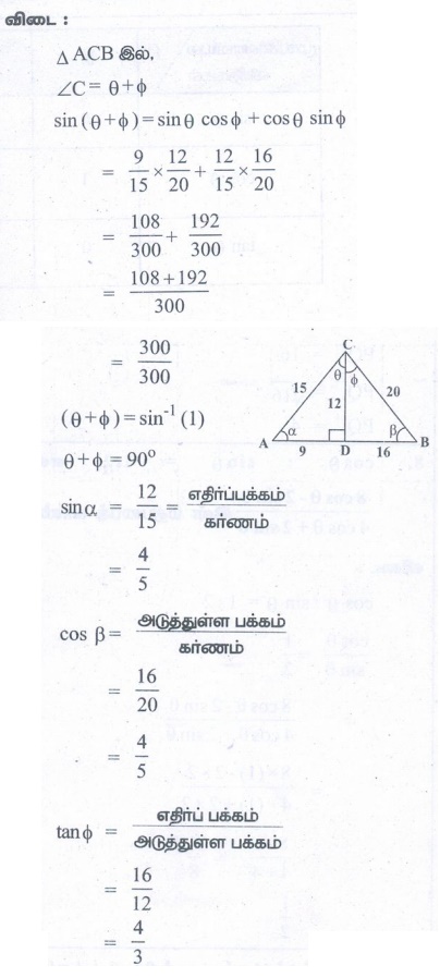 + ∅ =90o என மெய்பிக்க. இப்படத்தில் மேலும் இரு செங்கோண முக்கோணங்கள் உள்ளன என்பதை மெய்ப்பித்து, sin α, cos β மற்றும்