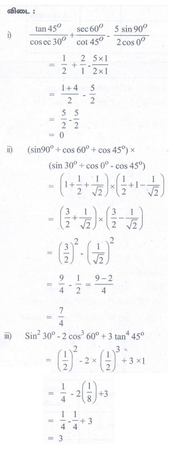 எண்ணியல் கணக்குகள் பதில்கள் மற்றும் தீர்வுகள் | முக்கோணவியல் | கணக்கு - பயிற்சி 6.2: சில சிறப்புக் கோணங்களின் முக்கோணவியல் விகிதங்கள் (Trigonometric Ratios of Some Special Angles) | 9th Maths : UNIT 6 : Trigonometry