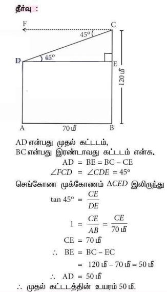 2. இரண்டு கட்டடங்களுக்கு இடைப்பட்ட கிடைமட்டத் தொலைவு 70 மீ ஆகும். இரண்டாவது கட்டடத்தின் உச்சியிலிருந்து முதல் கட்டடத்தின் உச்சிக்கு உள்ள இறக்கக்கோணம் 45° ஆகும். இரண்டாவது கட்டடத்தின் உயரம் 120 மீ எனில் முதல் கட்டடத்தின் உயரத்தைக் காண்க.