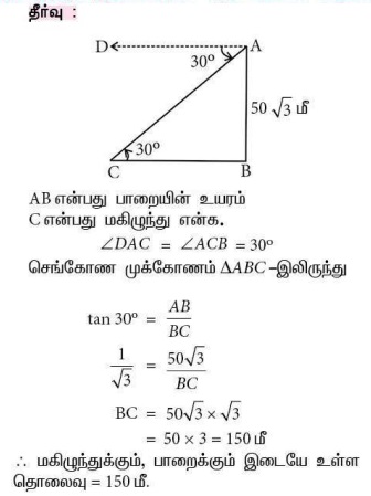 1. 50√3 மீ உயரமுள்ள ஒரு பாறையின் உச்சியிலிருந்து 30° இறக்கக்கோணத்தில் தரையிலுள்ள மகிழுந்து ஒன்று பார்க்கப்படுகிறது எனில், மகிழுந்திற்கும் பாறைக்கும் இடையேயுள்ள தொலைவைக் காண்க.