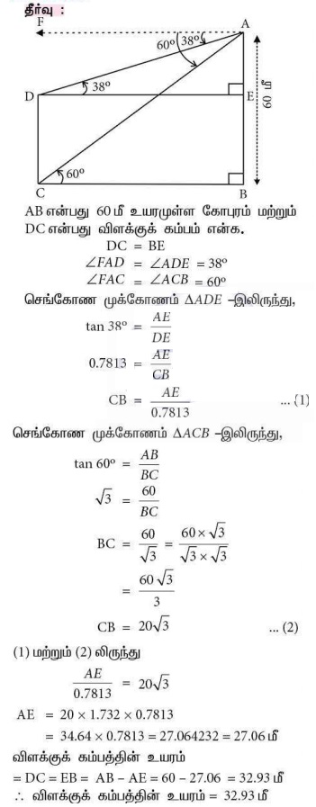 3. 60 மீ உயரமுள்ள கோபுரத்தின் உச்சியிலிருந்து செங்குத்தாக உள்ள ஒரு விளக்குக் கம்பத்தின் உச்சி மற்றும் அடியின் இறக்கக்கோணங்கள் முறையே 38° மற்றும் 60° எனில், விளக்குக் கம்பத்தின் உயரத்தைக் காண்க. (tan 38° = 0.7813, √3 = 1.732)