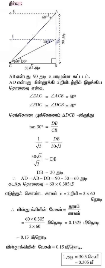 6. 90 அடி உயரமுள்ள கட்டடத்தின் மேலிருந்து ஒளி ஊடுருவும் கண்ணாடிச் சுவர் கொண்ட மின் தூக்கியானது கீழ் நோக்கி வருகிறது. கட்டடத்தின் உச்சியில் மின் தூக்கி இருக்கும்போது பூந்தோட்டத்தில் உள்ள ஒரு நீரூற்றின் இறக்கக்கோணம் 60° ஆகும். இரண்டு நிமிடம் கழித்து அதன் இறக்கக்கோணம் 30° ஆக குறைகிறது. மின்தூக்கியின் நுழைவு வாயிலிருந்து நீரூற்று 30√3 அடி தொலைவில் உள்ளது எனில் மின்தூக்கி கீழே வரும் வேகத்தைக் காண்க.