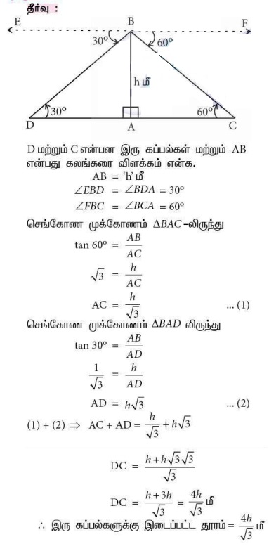 5. ஒரு கலங்கரை விளக்கத்தின் உச்சியிலிருந்து எதிரெதிர் பக்கங்களில் உள்ள இரண்டு கப்பல்கள் 30° மற்றும் 60° இறக்கக் கோணத்தில் பார்க்கப்படுகின்றன. கலங்கரை விளக்கத்தின் உயரம் h மீ. இரு கப்பல்கள் மற்றும் கலங்கரை விளக்கத்தின் அடிப்பகுதி ஆகியவை ஒரே நேர்கோட்டில் அமைகின்றன எனில், இரண்டு கப்பல்களுக்கு இடைப்பட்ட தொலைவு 4h/√3 மீ என நிரூபிக்க.