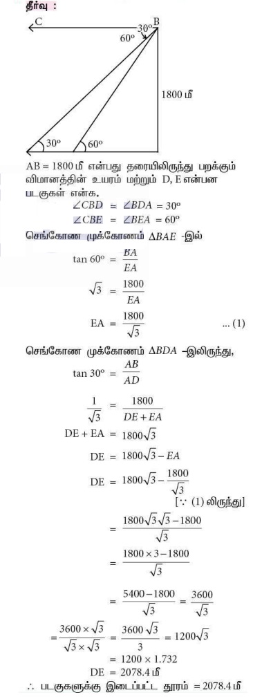 4. 1800 மீ உயரத்தில் பறக்கும் ஒரு விமானத்திலிருந்து ஒரே திசையில் விமானத்தை நோக்கிச் செல்லும் இரு படகுகள் பார்க்கப்படுகிறது. விமானத்திலிருந்து இரு படகுகளை முறையே 60° மற்றும் 30° இறக்கக் கோணங்களில் உற்று நோக்கினால், இரண்டு படகுகளுக்கும் இடைப்பட்டத் தொலைவைக் காண்க. (√3 = 1.732)