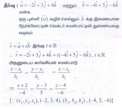 4. (5,6,7) மற்றும் (7,9,13) என்ற புள்ளிகள் வழியாகச் செல்லும் நேர்க்கோட்டின் திசைக் கொசைன்களைக் காண்க. மேலும், கொடுக்கப்பட்ட இவ்விரு புள்ளிகள் வழியாகச் செல்லும் நேர்க்கோட்டின் துணை அலகுவெக்டர் சமன்பாடு, மற்றும் கார்டீசியன் சமன்பாடுகளைக் காண்க.