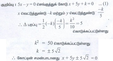 ஆய அச்சுகளுடன் அமைக்கும் முக்கோணத்தின் பரப்பு 5 ச. அலகுகள் எனில் அக்கோட்டின் சமன்பாடு