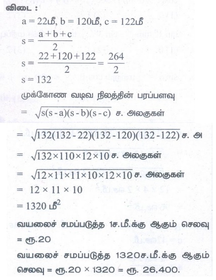 முக்கோண வடிவ நிலத்தின் பக்கங்கள் முறையே 22 மீ, 120 மீ மற்றும் 122 மீ எனில் வயலின் பரப்பளவைக் கணக்கிடுக. மேலும் வயலைச் சமப்படுத்த ஒரு சதுர மீட்டருக்கு ₹20 செலவாகும் எனில், வயலைச் சமப்படுத்த ஆகும் மொத்தச் செலவைக் கணக்கிடுக.