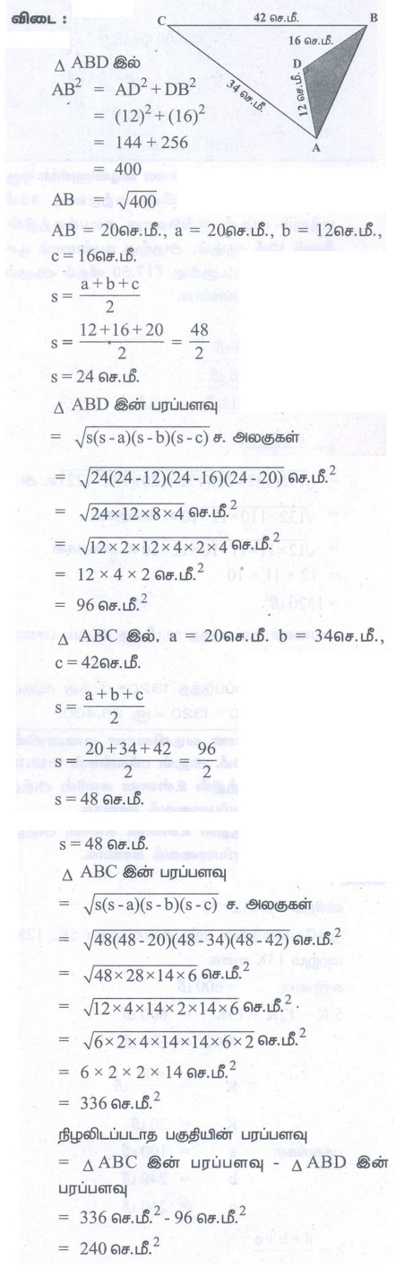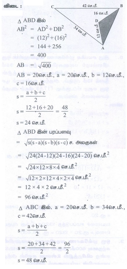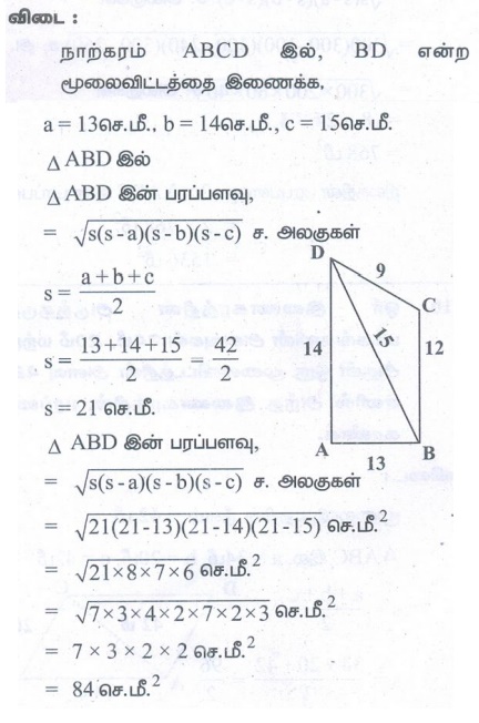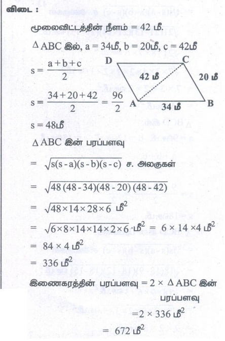 எண்ணியல் கணக்குகள் பதில்கள் மற்றும் தீர்வுகள் | அளவியல் | கணக்கு - பயிற்சி 7.1: நாற்கரங்களின் பரப்புகளைக் காண்பதில் ஹெரான் சூத்திரத்தின் பயன்பாடு (Application of Heron's Formula in Finding Areas of Quadrilaterals) | 9th Maths : UNIT 7 : Mensuration