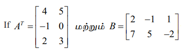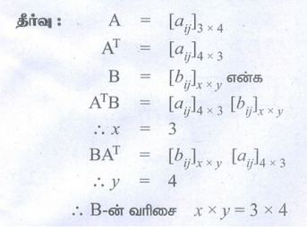 (16) 3 × 4 வரிசை உடைய ஒரு அணி A மற்றும் B என்ற இரண்டு அணிகளும் ATB மற்றும் BAT ஆகிய இரண்டையும் வரையறை செய்யுமாறுள்ள அணிகள் எனில், B அணியின் வரிசையைக் காண்க.