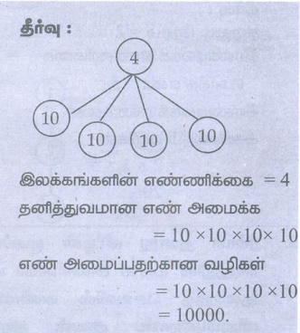 6. ஒரு நகைக் கடையில் உள்ள பாதுகாப்பு பெட்டகத்திற்கான திறவுக்கோல் எண் 4 இலக்கங்களைக் கொண்ட தனித்துவமான எண்ணாக அமைப்பதற்கு, ஒவ்வொரு இடமதிப்பிலும் 0 முதல் 9 வரையிலான 10 எண்களை கொண்டு உருவாக்க வேண்டுமெனில், ஒரு தனித்துவமானத் திறவுக்கோல் எண் அமைப்பதற்கு எத்தனை விதமான வழிகள் உள்ளது?