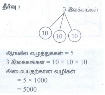 5. பள்ளி மாணவர்களுக்கான நான்கு இலக்க வரிசை எண்ணில், முதல் இலக்கம் A, B, C, D மற்றும் E என்ற ஐந்து எழுத்துக்களில் ஏதாவது ஒரு ஆங்கில எழுத்தினைக் கொண்டும், அதனைத் தொடர்ந்து வரும் மூன்று இலக்கங்கள் ஒவ்வொன்றும் 0 முதல் 9 வரையிலான 10 எண்களைக் கொண்டும் அமைந்துள்ளது எனில் வரிசை எண் அமைப்பதற்கு எத்தனை விதமான வழிகள் உள்ளது? (A000, B000, C000, D000 மற்றும் E000 தவிர )