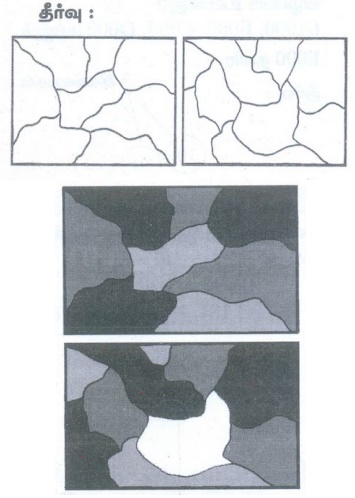 10. கொடுக்கப்பட்டுள்ள நில வரைபடத்தில் மிகக் குறைந்த அளவு எண்ணிக்கையிலான வண்ணங்களைக் கொண்டு அடுத்தடுத்த இரண்டு பகுதிகள் ஒரே வண்ணத்தில் அமையாதவாறு வண்ணமிடுக