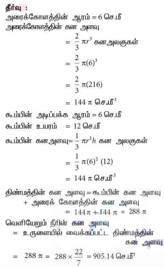 4. ஒரு திண்மத்தின் அடிப்புறம் 6 செ.மீ ஆரம் உடைய அரைக்கோள வடிவிலும் மேற்புறம் 12 செ.மீ உயரமும் 6 செ.மீ ஆரமும் கொண்ட கூம்பு வடிவிலும் உள்ளது. முழுவதும் நீரால் நிரப்பப்பட்ட ஓர் உருளையின் அடிப்புறத்தைத் தொடுமாறு அத்திண்மம் வைக்கப்படும் போது வெளியேறும் நீரின் கனஅளவைக் காண்க. உருளையின் ஆரம் 6 செ.மீ மற்றும் உயரம் 18 செ.மீ எனக் கொள்க.