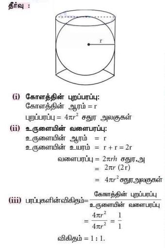 7. ஆரம் r அலகுகள் கொண்ட ஒரு கோளம் ஒரு நேர் வட்ட உருளையினுள் மிகச் சரியாகப் பொருத்தப்பட்டுள்ளது எனில், கீழ்க்கண்டவற்றைக் கணக்கிடுக.