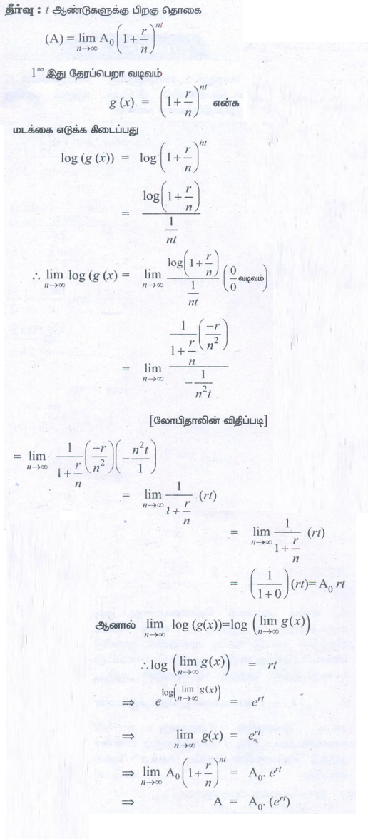 12. A0 எனும் ஆரம்பத் தொகையானது, ஒரு வருடத்திற்கு n முறை r என்ற வட்டி வீதத்தில் கூட்டுவட்டி முறையில் முதலீடு செய்யப்படுகிறது எனில், முதலீடு செய்யப்பட்டு t வருடத்தில் அந்தத் தொகையின் மதிப்பு A = A0(1+r/n)nt . வட்டியானது தொடர்ச்சியான வட்டி முறையில் (அதாவது n → ∞) கணக்கிடப்பட்டால், t காலத்திற்குப் பின்னர் அந்தத் தொகையின் மதிப்பு A = A0e rt எனக்காட்டுக.