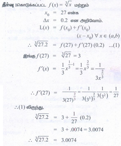 1. f (x) = 3√x என்க. x = 27 இல் நேரியல் தோராய மதிப்பைக் காண்க. நேரியல் தோராயமதிப்பை பயன்படுத்தி 3√27.2 ன் மதிப்பைக் காண்க.